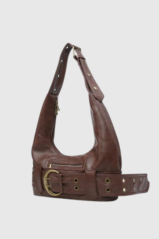 Caro Belt Patchwork Faux Leather Bag In Brown