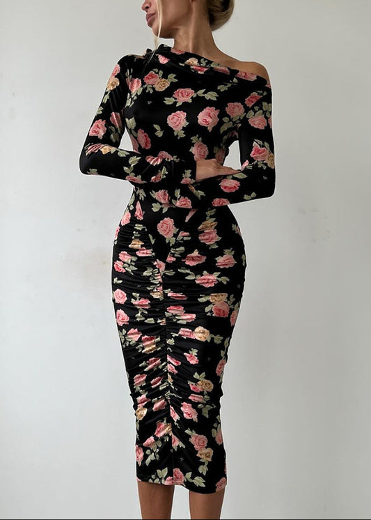 Dominika Floral Bodycon Ruch Midi Dress In Black