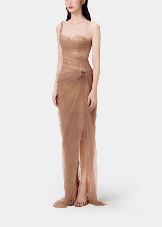 Decima One Shoulder Corset Mesh Maxi Dress In Light Brown