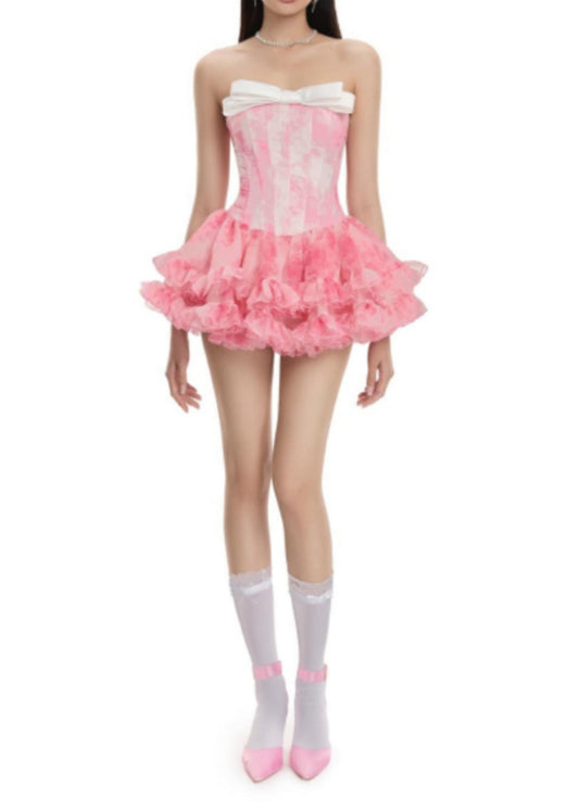 Berry Strapless Bow Mesh Ruffle Skirt Set