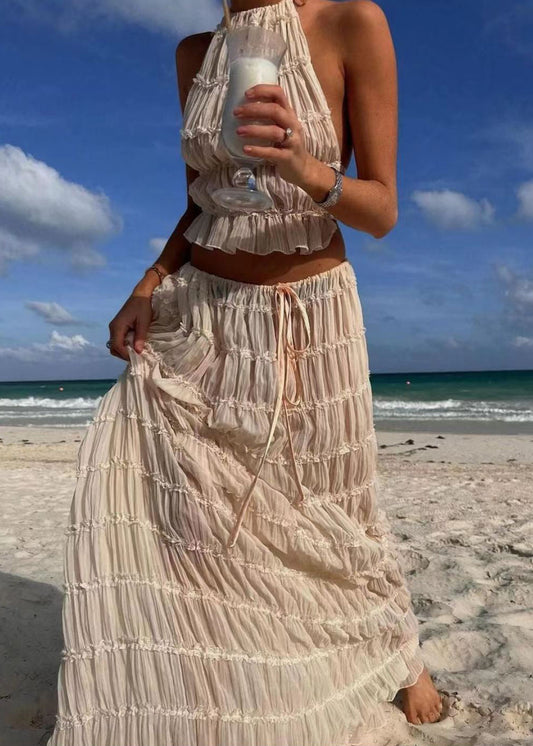 Bean Lace Up Ruch Mesh Skirt Set In Khaki