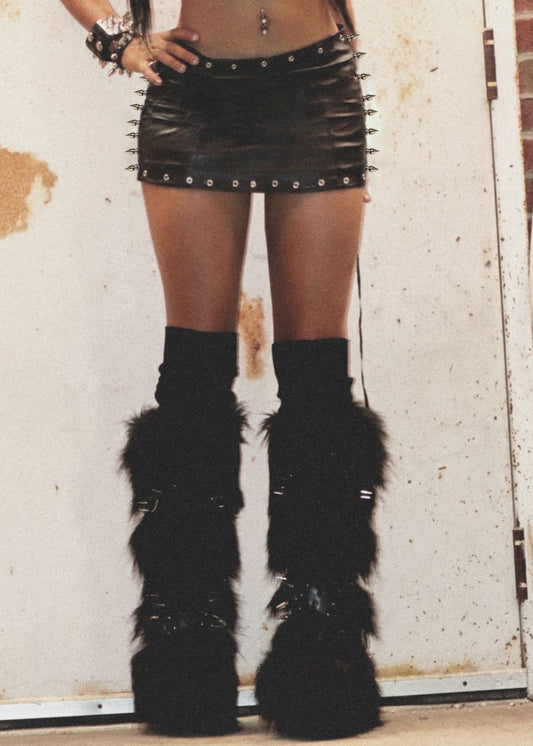 Afroditi Buckle Ruffle Split Short Leather Skirt